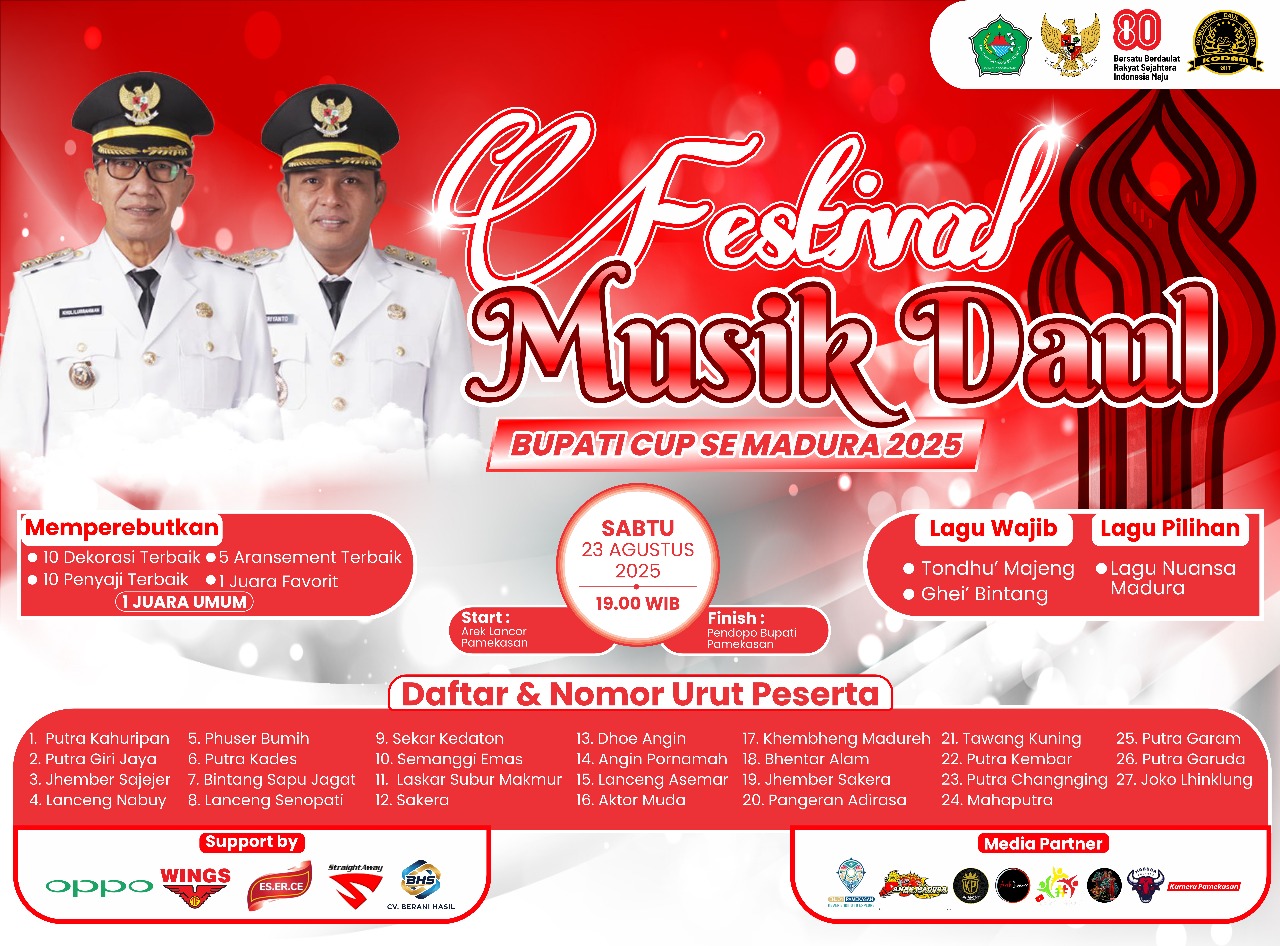 RETORIK.ID, Pamekasan – Pemerintah Kabupaten (Pemkab) Pamekasan berkolaborasi dengan Komunitas Daul Madura (Kodam) akan menggelar Festival Musik Daul Bupati Cup se-Madura pada Sabtu 23 Agustus 2025, pukul 19.00 WIB. Rute dimulai dari Monumen Arek Lancor menuju Pendopo Ronggosukowati.